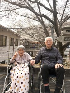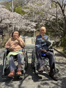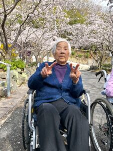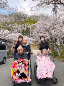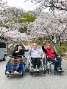 施設前には毎年桜のトンネルができます。 お天気の良い日には外に出てお花見!! ご利用者様も大変喜ばれました。